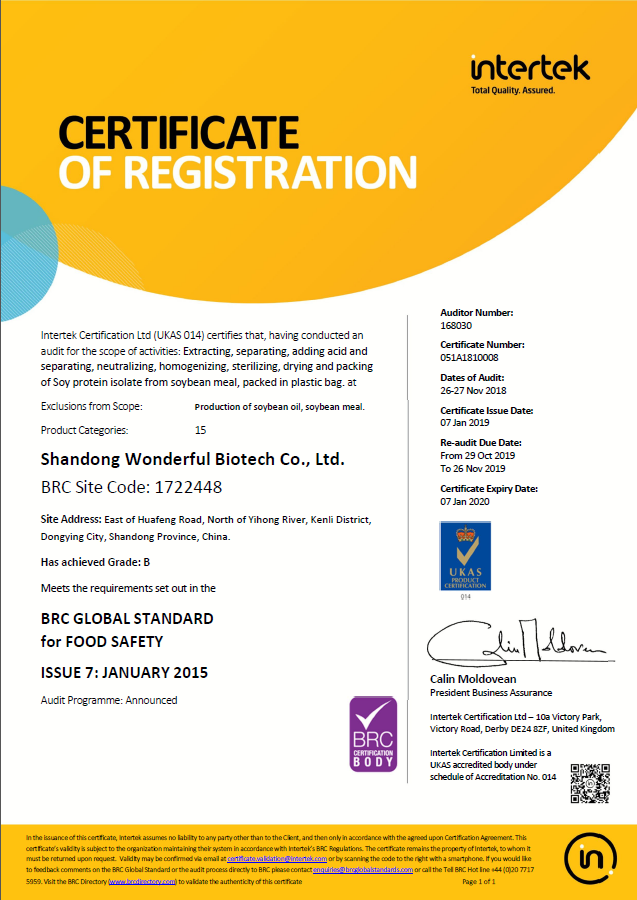 恭賀我公司大豆分離蛋白產(chǎn)品通過BRC認證